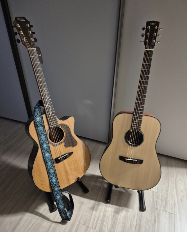 기타가 생각보다 너무너무 예뻐요 상판과 뒷면 모두, 나무가 고급스러워요 소리도 따뜻한 게 너무 좋구요!